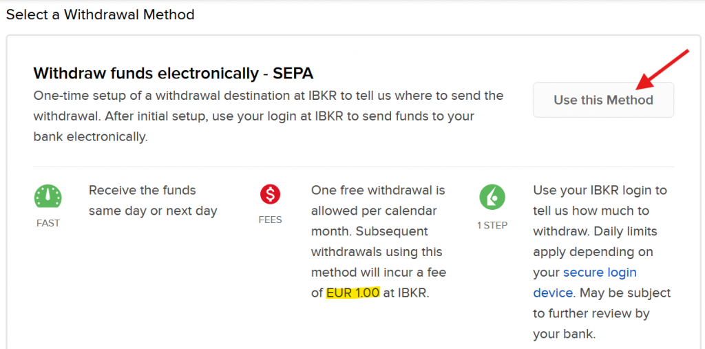 Click Use this Method. Note that first withdrawal per month is free of charge and subsequent withdrawals will cost EUR 1 each.