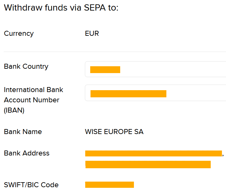 Fill out the details of your EUR Wise account (mainly bank country and IBAN). You can find the Wise bank account details in your Wise app/account. Once you plug in the details, IBKR will recognize the bank and display the complete address and SWIFT code and assign a nick name.