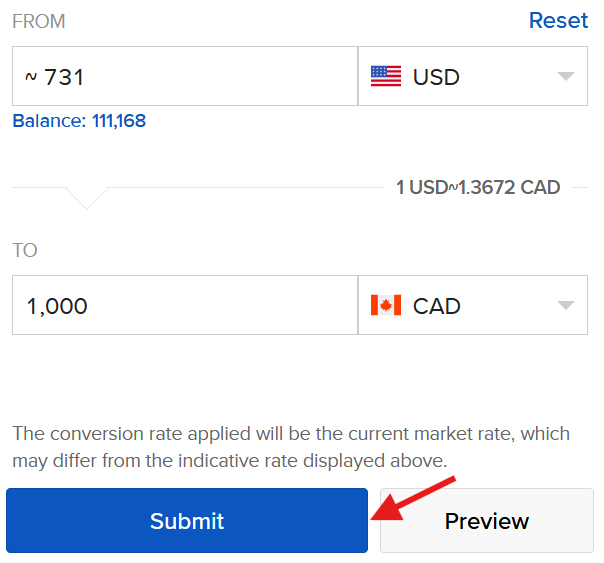 Fill the amount you want to convert or the amount you want to have in the end. For example, here I want to receive 1000 CAD and based on the current FX market rate, the corresponding USD amount is shown. Click submit to execute the FX trade. Generally this will be an odd lot order (you will get a pop-up to acknowledge that) and the trade will be executed immediately.