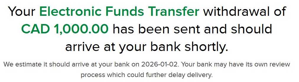 And indeed, on Jan 2, 2026, I received $1000 CAD in my TD Bank.